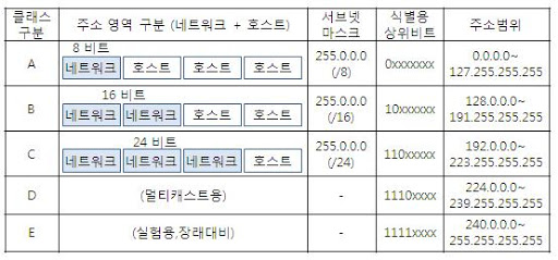 A클래스는 0.0.0.0 ~ 127.255.255.255 (100000000) / 네트워크 주소는 앞에 8비트