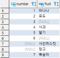 위의 쿼리를 다시 풀어 써 보자면, 괄호 안에 들어갈 요소들은 (1, 2, 3, 4, 5, 6, null, null, 7)이 된다.
